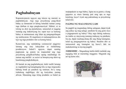 Ang paghahayupan ay pag-aalaga ng ibat-ibang hayop tulad ng baboy manok kambing baka at iba paIto mahalagang bahagi ng agrikultura dahil ito ang nag susuplay ng karne gatas at itlog. Kung magkakapatid ang mga biik dapat hindi nagkakalayo. Ang mga baboy ay mga unggulado hayop na may kuko o hoof na nasa Klaseng MamalyaLikas sa Eurasya sama-sama silang nakapangkat sa genus Sus ang pamilyang SuidaeMaliban sa reputasyon nila sa pagiging matakaw at marumi isang hindi gaanong kilalang katangian ng baboy ang katalinuhan.