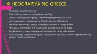 Kabihasnang Klasikal ng Greece. Sa gitna ng masalimuot na kasaysayang dulot ng pananakop ng mga dayuhan napanatili ng lugar ang kanilang tradisyon. Mailalarawan ang heograpiya ng Gresya.