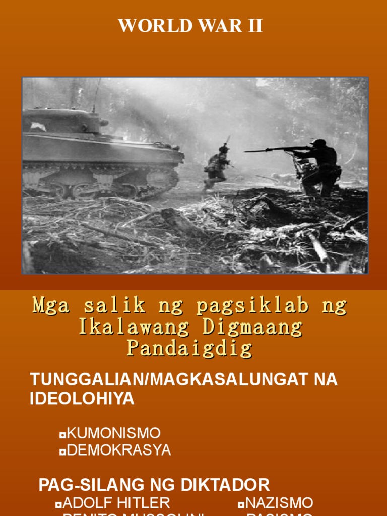 Pano nag simula ang world War 2 at bakit. IKALAWANG DIGMAANG PANDAIGDIG. Tinuturing ito na pinakamalawak pinakamahal at pinakamadugong labanĂ¡n sa kasaysayan ng sangkatauhan.