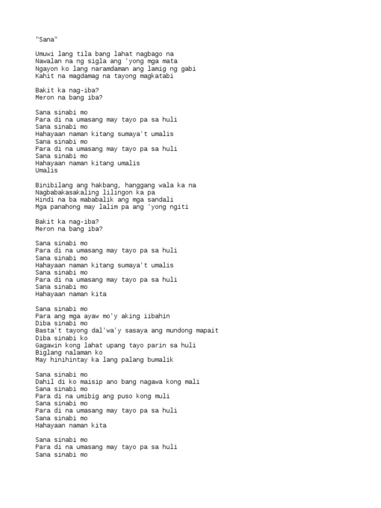 Sana sinabi mo Para di na umasang may tayo pa sa huli Sana sinabi mo Hahayaan naman kitang sumayat umalis Sana sinabi mo Para di na umasang may tayo pa sa huli Sana. Posted by vendetta at 1102 PM No comments. Sana sinabi mo hahayaan naman kitang sumayat umalis.