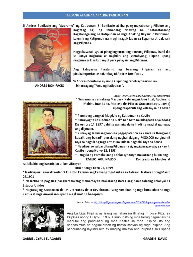 Araling Panlipunan 26112020 1455 cyrilc310 Ang nagawa ni andres bonifacio para sa kalayaan ng ating bansa. Subject Matter Himagsikang Filipino Mga Ambag ni Andress Bonifacio Katipunan at Himagsikanng 1896 sa pagbuo ng Pilipinas. Dahil si Gabriela Silang ang kauna unahang naging lider ng isang rebolusyon sa ating bansa malaki ang epekto nito sa ating kasaysayan dahil nagsilbi itong pasimula ng pagbibigay karapatan sa mga kababaihan na manguna o maging lider sa.