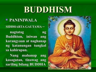 Sa oras na namatay si Guatama ang Budismo ay naging pangunahing impluwensya sa India. Vedas - ang kanilang banal na aklat. Sya ay tinaguriang the enlightened one o si Bhudda.