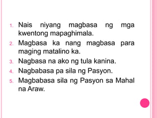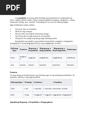 Mga Pandiwa sa Ibat ibang Aspekto o Panahunan Salitang-ugat Pangnagdaan Pangkasalukuyan Panghinaharap Pawatas Katatapos abot deliverhand over nag-abot nag-aabot mag-aabot mag-abot kaaabot abutin reach forhand over inabot inaabot aabutin abutin agaw take by force nag-agaw nag-aagaw mag-aagaw mag-agaw kaaagaw. Magbabasa sila ng Pasyon sa Mahal na Araw. Nakahuli sila ng malaking sawa sa bakuran.